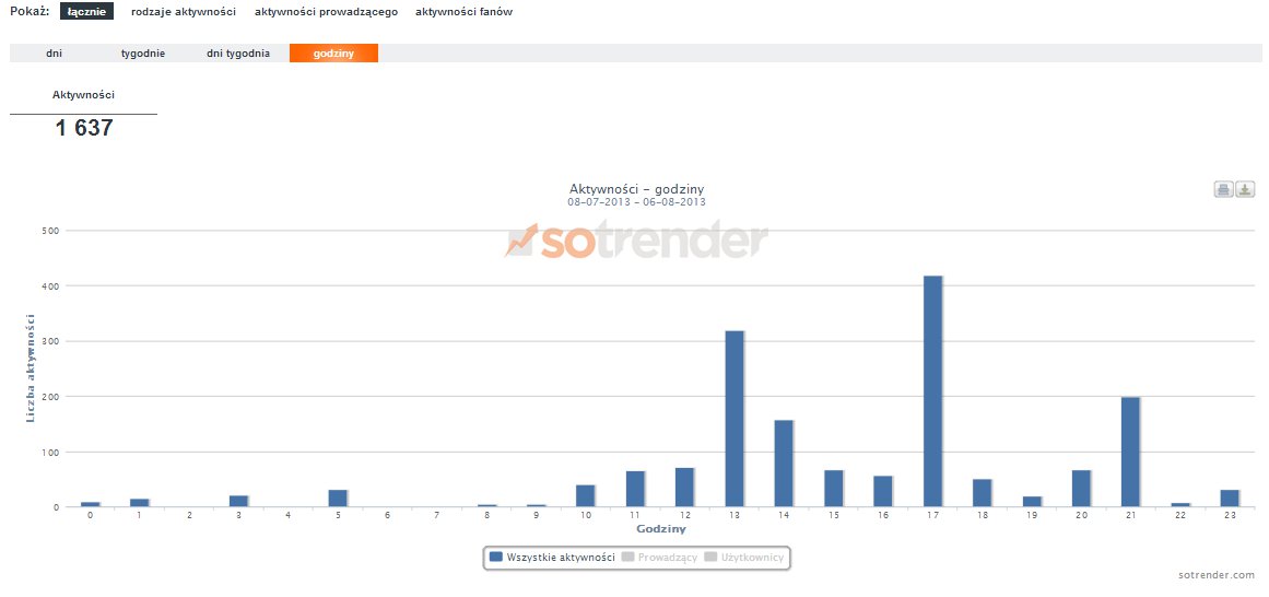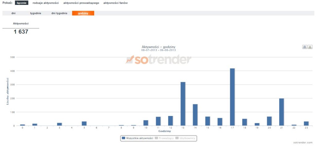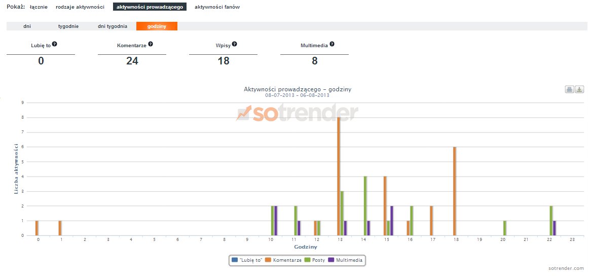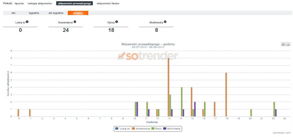 Widzimy, że najwięcej użytkowników angażuje się w prowadzoną przez nas komunikację wieczorem? Może właśnie wtedy warto publikować więcej wpisów? Sotrender śledzi również działalność prowadzącego fanpage i pokazuje, w których godzinach jest on najaktywniejszy, a kiedy nie publikuje nowych postów. Może warto to zmienić?