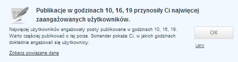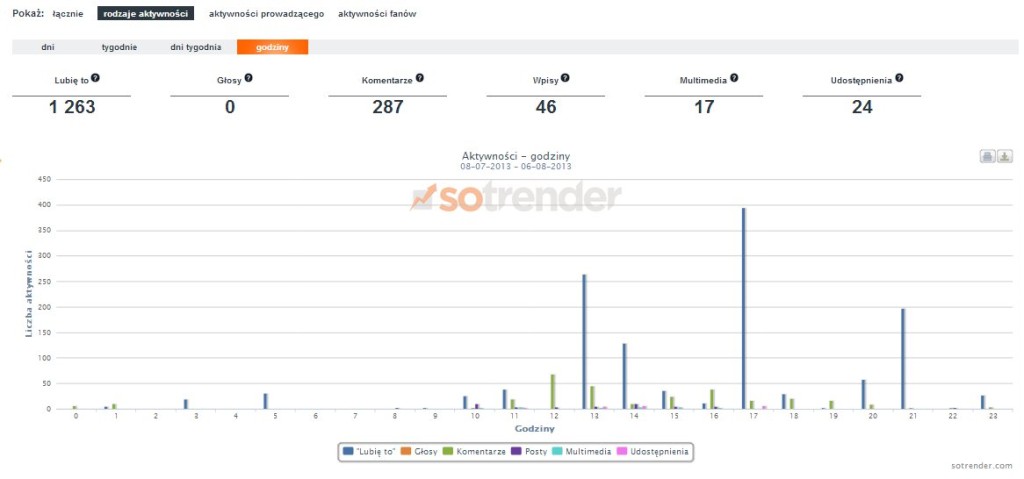 Jednak informacja, że wielu fanów profilu zobaczyło opublikowany post nie przekłada się na korzyści dla marki. Dlatego też Sotrender wskazuje pory, w których fani są najaktywniejsi, czyli angażują się w największą liczbę interakcji. Publikowanie właśnie w tych porach zwiększa szanse na zobaczenie naszego wpisu oraz na interakcję ze stroną, poprzez polubienie, skomentowanie lub udostępnienie.