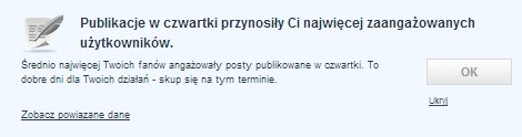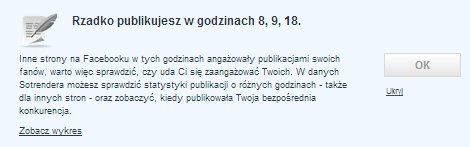 Aby w pełni korzystać z wiedzy dostarczanej przez Sotrender, nie trzeba być ekspertem w analizowaniu wykresów. Chcąc zaoszczędzić czas użytkowników naszego narzędzia, wprowadziliśmy do niego nową funkcjonalność – automatyczne wskazówki, działające w oparciu o algorytmy data-mining. Pomogą one w interpretowaniu danych, dostarczając porad, które od razu można wprowadzić w życie, aby prowadzić jeszcze skuteczniejszą komunikację. Dzięki wskazówkom dowiemy się nie tylko, kiedy aktywność fanów jest najwyższa i kiedy najlepiej publikować, ale również w jakich porach warto spróbować to robić.