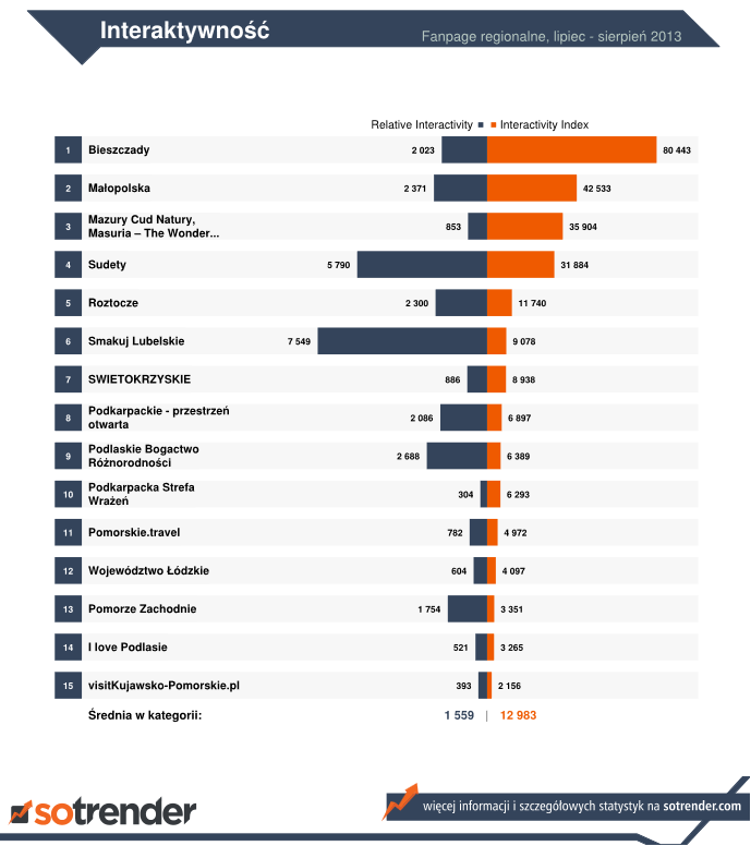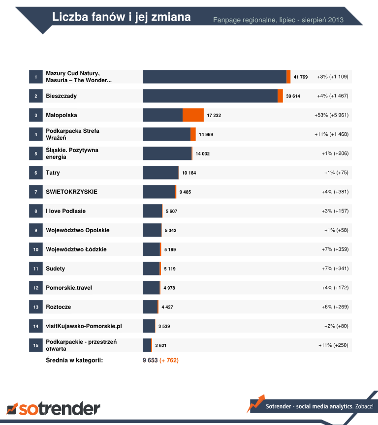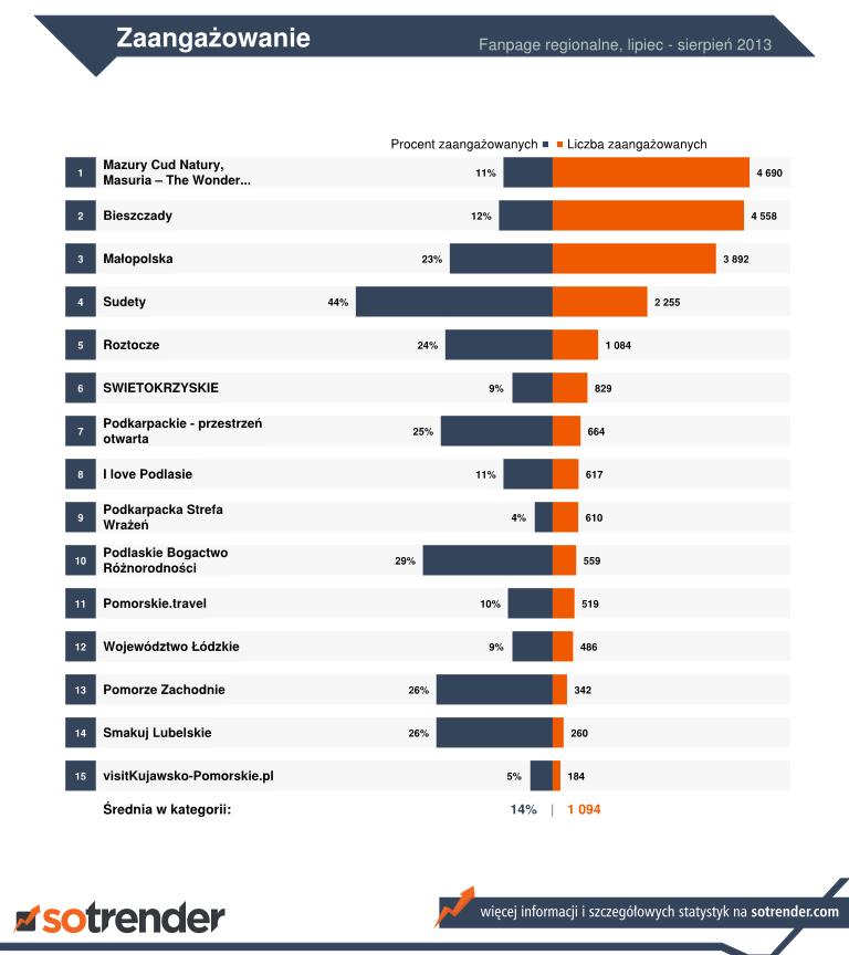 Sotrender przeanalizował 1394 wpisy opublikowane przez 20 profili poświęconych regionom w okresie od 1 lipca do 31 sierpnia. 2013 r.
