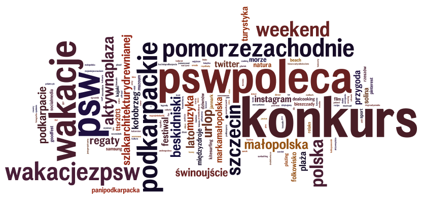 W podobnej konwencji utrzymane są również najchętniej używane hastagi. Najpopularniejsze z nich to #konkurs, którego użyto 24 razy, #pswpoleca, wykorzystany 20 razy oraz #psw, który w ciągu dwóch letnich miesięcy pojawił się w postach 18 razy. Warto zauważyć, że dwa ostatnie były wykorzystywane przez jeden fanpage, a mianowicie Podkarpacką Strefę Wrażeń.