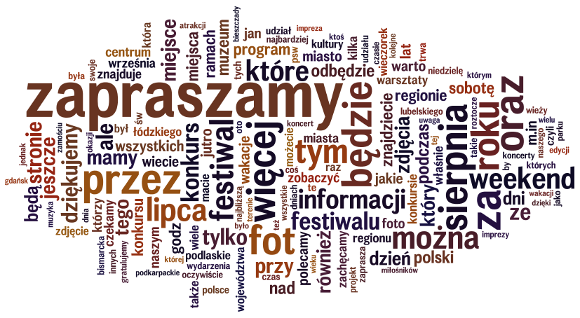 Jak widać z poniższej chmury słów najchętniej używanych przez administratorów, wpisy publikowane przez profile poświęcone regionom koncentrowały się wokół tematyki wakacyjno-wyjazdowej. Najczęściej we wpisach pojawiało się słowo “Zapraszamy”, a także nazwy letnich miesięcy, jak również słowo “weekend”, “festiwal” czy “informacji”.