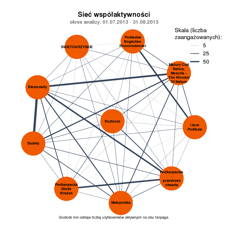Na poniższym wykresie przedstawiliśmy natomiast współaktywności fanów poszczególnych profili. Najwięcej współaktywnych fanów zanotował profil Bieszczady – zarówno z górzystymi Sudetami, jak i odmiennymi krajobrazowo – Mazurami. Dużą współaktywność notują również strony z tego samego regionu. W przypadku Podkarpacia są to Podkarpacie – Przestrzeń Otwarta oraz Podkarpacka Strefa Wrażeń, a także na Podlasiu – między profilami Podlaskie Bogactwo Różnorodności i I love Podlasie.