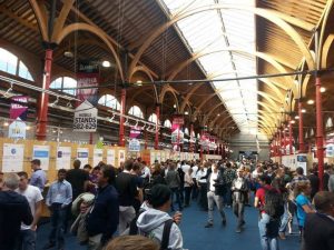 3. Targi: malutkie stoiska z nieoklejonej płyty paździerzowej i kilkaset startupów stłoczonych na małej przestrzeni, z niezbyt jasnym podziałem na sektory.