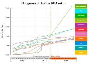 Kilkanaście dni temu podczas VI Kongresu Online Marketing zaprezentowaliśmy raport pt. “Social media is so trendy”, w którym zawarliśmy prognozy dotyczące wzrostu największych polskich stron. Jedna z nich dotyczyła Roberta Lewdandowskiego, który w listopadzie wyprzedził w rankingu największych polskich stron Serce i Rozum, królujących w nim przez ostatnie 10 miesięcy. Oczywiście należy pamiętać, że znaczna część fanów piłkarza pochodzi spoza Polski, a jego profil powstał w wyniku połączenia kilkunastu innych stron oraz jest wspierany w ramach kampanii reklamowej dużej marki. Niemniej jednak sytuacja ta nie miała precendensu – po raz pierwszy w historii #FanpageTrends pierwsze miejsce w zestawieniu największych polskich profili zajmuje strona poświęcona osobie. Jak można przeczytać w wyżej wspomnianym raporcie, jeśli strona Lewego zyskiwałaby fanów tak samo szybko, jak w przeciągu ostatnich 8 miesięcy, na koniec 2014 r. liczba jego zwolenników na Facebooku przekroczyłaby 5, 5 mln, podczas gdy liczba fanów Serca i Rozumu oraz Play oscylowałaby w granicach 3 mln.