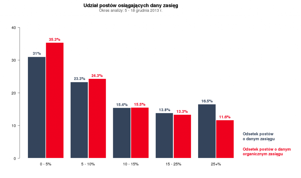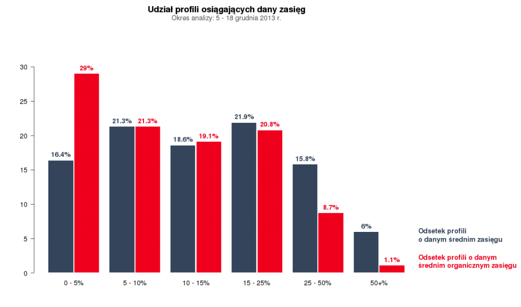 Podobnie, wiele profili ma problem z zasięgiem, choć trafiają się wyjątki, które potrafią docierać do kilkudziesięciu procent fanów. W przypadku prawie 30% profili przeciętnie post trafiał do mniej niż 5% ich liczby fanów. Z drugiej strony dla ponad 20% stron łączny zasięg (na który składa się zasięg organiczny i płatny) przekroczył 25% ich bazy fanów. W przypadku 6% profili łączny zasięg wyniósł przeciętnie nawet ponad 50% ich bazy fanów. Biorąc pod uwagę tylko zasięg organiczny widownie odpowiadającą ponad 25% liczby fanów udało się zebrać 10% stron. Natomiast tylko 2 profile uzyskały średni zasięg postów przekraczający 50% ich bazy fanów.