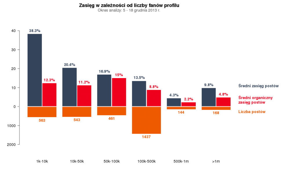 - strony o wielkości do 100 tys. fanów. uzyskiwały przeciętnie zasięg kilkunastoprocentowy,