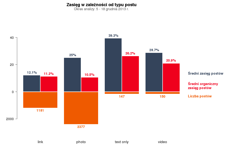 Najlepszy zasięg organiczny osiągają wpisy tekstowe, a po nich posty zawierające wideo. W przypadku organicznego zasięgu wynosiło on odpowiednio 1/4 i 1/5 liczby fanów. Szczególnie wysoki zasięg wideo może być związany z pogłoskami o planach wprowadzenia reklam tego typu przez portal.
