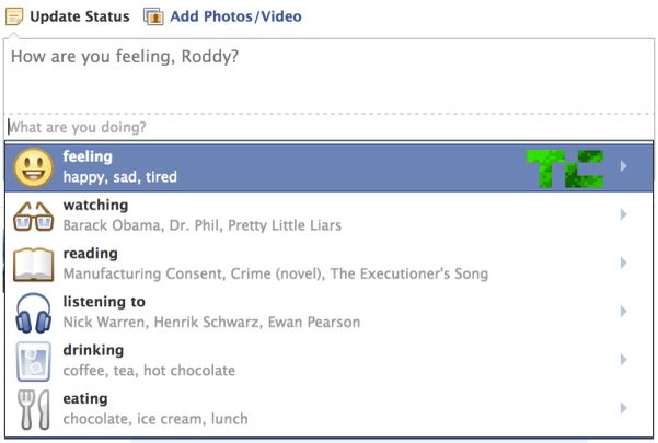 …i nie pozwala administratorom profili spocząć na laurach. Chwilę po 9 urodzinach, serwis zaprezentował nowe opcje wpisywania statusu, dzięki którym można na bieżąco komunikować to, co użytkownik w danej chwili czyta, czego słucha lub jak się czuje.