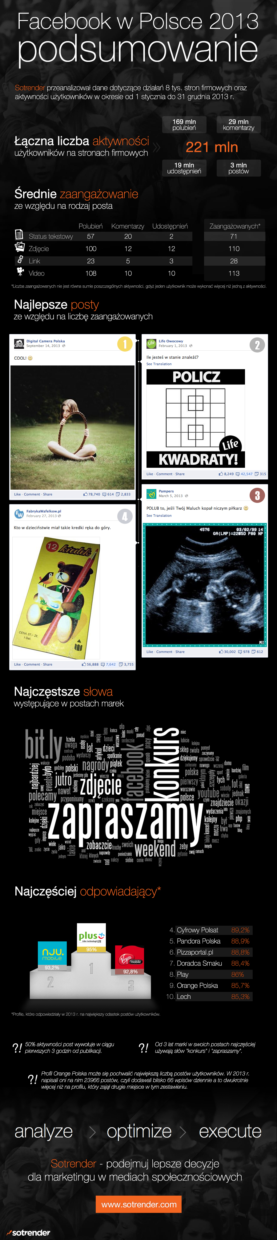 Wspominając wstęp do zeszłorocznego podsumowania roku, moglibyśmy napisać, że “na Facebooku bez zmian”. Na przekór wieszczącym rychły spadek zainteresowania serwisem, liczba użytkowników nadal rośnie, choć wolniej. Komunikacja marek i firm z klientami za pośrednictwem Facebooka zyskuje nowy wymiar. Serwis staje się pełnoprawnym biurem obsługi klientów, łącząc wygodę i szybkość wymiany informacji. Zapraszamy do lektury podsumowania najważniejszych działań marek, aktywności użytkowników oraz wydarzeń i trendów, które dominowały na Facebooku w Polsce w 2013 r.