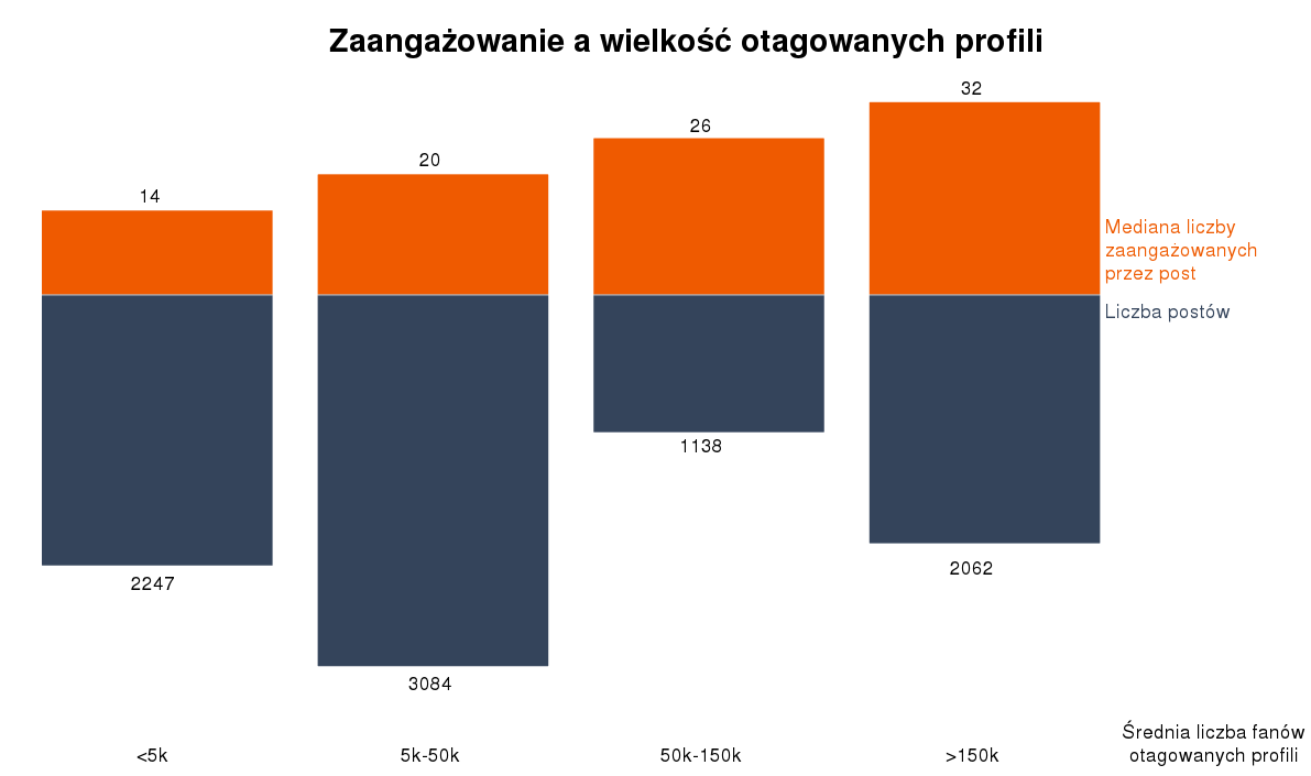 Sprawdziliśmy również, czy popularność stron, które tagujemy w poście ma wpływ na zaangażowanie użytkowników. W tym celu dla każdego z postów zawierających tagi obliczyliśmy średnią liczbę fanów oznaczonych profili. Wyniki potwierdziły nasze przypuszczenia – im więcej fanów liczyły otagowane strony, tym bardziej post był angażujący. Posty zawierające oznaczenia profili o średniej liczbie fanów przekraczającej 150 tys. angażowały dwukrotnie więcej użytkowników niż posty, w których otagowane profile liczyły mniej niż 5 tys. fanów.
