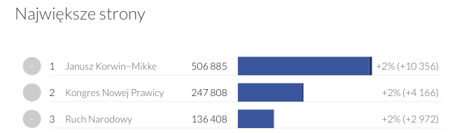Jak przed wyborami samorządowymi prezentuje się polityczna panorama Facebooka? Wielkiego zaskoczenia nie ma, na prowadzeniu nadal Kongres Nowej Prawicy. W zestawieniu najbardziej angażujących w październiku stron prowadzą właśnie KNP, Janusz Korwin-Mikke oraz Przemysław Wipler. W tym samym zestawieniu pojawiło się też kilka nowych postaci, takich jak Hanna Zdanowska, pełniąca funkcję prezydenta Łodzi, Radosław Sikorski czy rzecznik prasowy Wolnych Konopi, Maciej Kowalski. Ten ostatni dotarł też prawie na podium w kategorii najbardziej interaktywnych profili- jego strona przesunęła się o 9 miejsc, a pod względem wskaźnika Relative Interactivity znacząco wyprzedziła inne profile w tym rankingu.