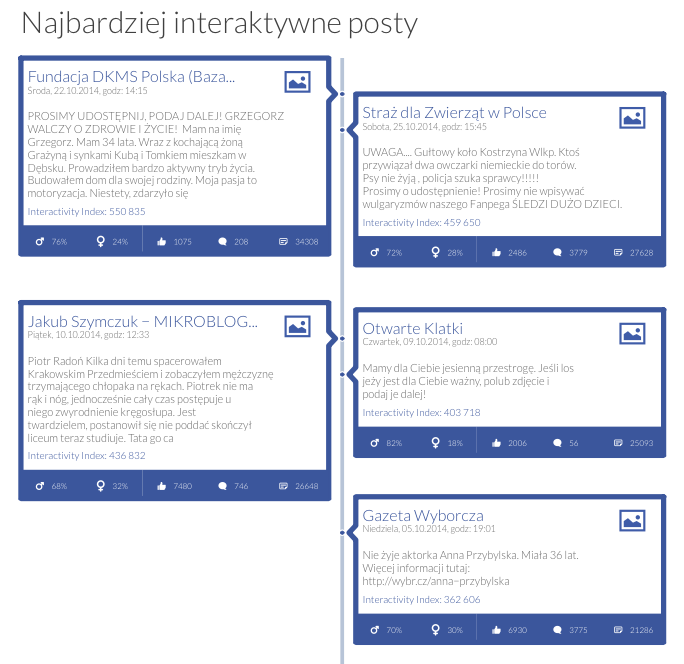Październik to również czas, gdy w Facebookowe rankingi zaczynają odzwierciedlać popularność programów wprowadzonych przez stacje telewizyjne do nowych ramówek. Niewątpliwym triumfatorem jest w tym miesiącu strona programu Top Model TVN, której administratorom ewidentnie udało się dotrzeć do użytkowników Facebooka. Po skoku o 17 miejsc profil Top Model, jako jedyny reprezentuje programy telewizyjne w ogólnym rankingu najbardziej angażujących stron polskojęzycznych. Z kolei analizując zestawienie najpopularniejszych treści w październiku, można odnieść wrażenie, że Polacy bardzo przejmują się cierpieniem innych ludzi oraz zwierząt. Posty opublikowane przez profile takie jak Fundacja DKMS Polska, Straż dla Zwierząt w Polsce czy Jakuba Szymczuka – MIKROBLOG zebrały w październiku ogromną ilość aktywności, zwłaszcza udostępnień.