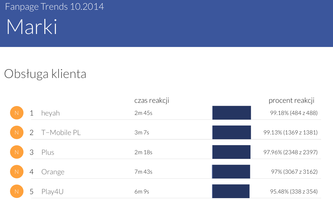 Tak jak YouTube i Twitter Trends, tak i raport Fanpage Trends przeszedł w tym miesiącu gruntowne odświeżenie, zwłaszcza wizualne. Oprócz oczywistej zmiany kolorów okładek i wyglądu rankingów, które są teraz bardziej przejrzyste i przyjemniejsze dla oka, metamorfozę przeszła także infografika. Od teraz prezentujemy ją w formie dwustronicowej, dzięki czemu mogliśmy zmienić również sposób prezentacji najlepszych treści miesiąca. Z kolei w zestawieniach dla poszczególnych kategorii zagościł nowy rodzaj rankingów – tym razem biorący pod uwagę szybkość i jakość prowadzonej przez strony “Obsługi klienta”. Ranking uwzględnia strony na Facebooku, których administratorzy wyróżniają się wyjątkowo szybkim czasem i procentem reakcji na posty użytkowników. Pierwsze miejsca w rankingu wszystkich stron polskojęzycznych zajmują bez zaskoczenia sieci telefonii komórkowej. Warto zwrócić uwagę na to, jak wielką pracę wykonują każdego miesiąca moderatorzy tych profili. Dla przykładu w październiku najwięcej postów w skali całego miesiąca użytkownicy zamieścili właśnie na stronie Orange, łącznie 3 389, czyli aż po 113 postów dziennie. Dla odmiany Plus w minionym miesiącu na zapytania użytkowników odpowiadał średnio po… 2 minutach 18 sekundach. W zestawieniu znajdziemy też m.in. Cyfrowy Polsat, UPC, mBank czy Polski Bus.