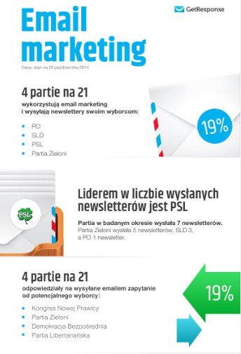 Jak wynika z analizy GetResponse, tylko 4 partie na 21 wykorzystują email marketing i wysyłają newslettery wyborcom. To pokazuje, że wśród większości partii dominuje pogląd, że email i newslettery są już przestarzałym narzędziem, a do wyborców w internecie znacznie lepiej docierać chociażby za pomocą mediów społecznościowych.