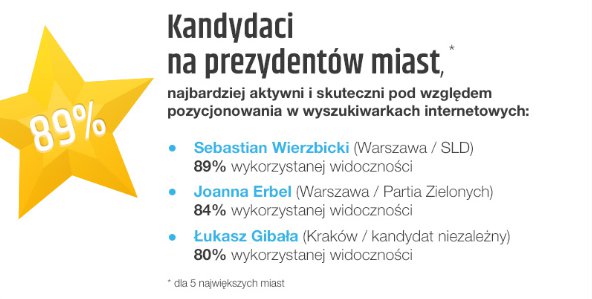 Można za to pocieszać się, że byli kandydaci na prezydentów miast (pięciu największych), którzy byli aktywni i skuteczni pod względem pozycjonowania w wyszukiwarkach internetowych. Pierwsze miejsce zajął Sebastian Wierzbicki, kandydat SLD w Warszawie.