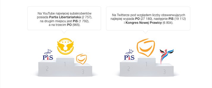 Ciekawym przypadkiem jest Partia Libertariańska, która – pomimo bardzo małego poparcia w skali kraju – ma na YouTube kanał posiadający więcej subskrybentów niż PO czy PiS. Z kolei królujący na Facebooku Kongres Nowej Prawicy na Twitterze ma trzecie miejsce pod względem liczby obserwujących. Na szczycie Twitterowego podium stoi PO, potem PiS.