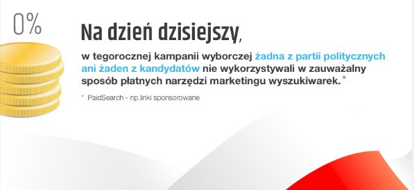 Dane z wyszukiwarek pokazują, że marketerzy politycznych partii nie pomyśleli o wykorzystywaniu płatnych narzędzi marketingu wyszukiwarek, takich jak np. linki sponsorowane. Żadna z partii ani żaden z kandydatów nie wykorzystali ich w zauważalny sposób.