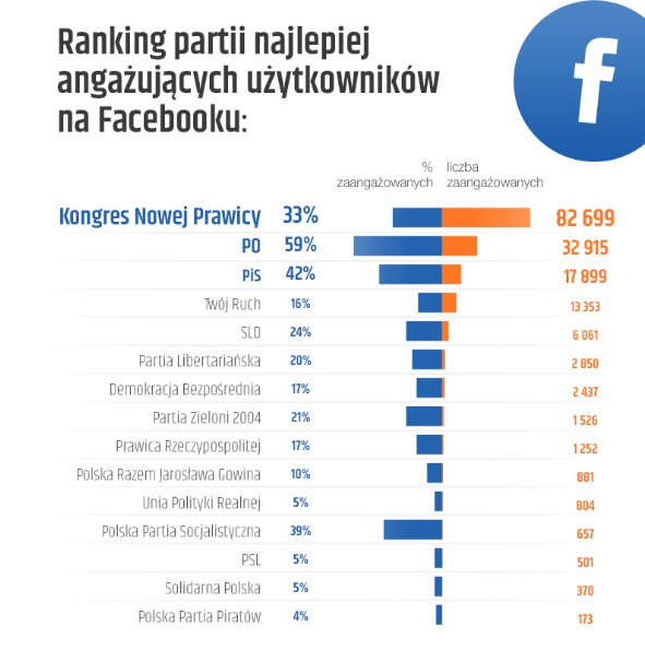 KNP, PO i PiS prowadzą też w rankingu partii najlepiej angażujących na Facebooku. Co ciekawe, największy procent zaangażowanych zaraz po tych partiach posiada Polska Partia Socjalistyczna. Mimo małej liczby fanów, aż 39% z nich było w badanym okresie aktywnych na stronie PPS.