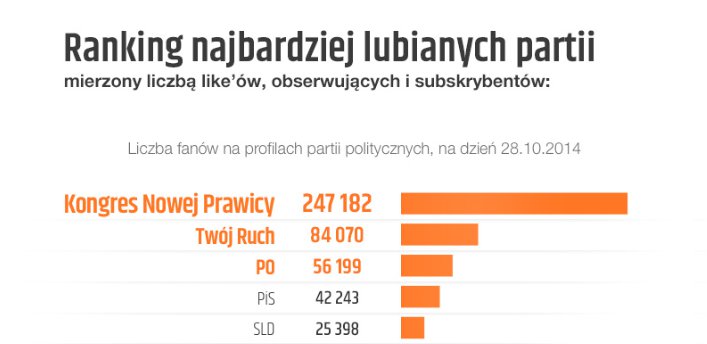 Dane Sotrendera potwierdzają, że partie za najważniejszą internetową platformę komunikacyjną uznają wciąż Facebooka. Wszystkie 21 partii ma na nim konta, jednak tylko 15 z nich posiada także profil na Twitterze, a 17 na YouTube. Jeśli chodzi o najpopularniejszą na Facebooku partię, to nie ma zaskoczenia – w liczbie fanów wciąż króluje Kongres Nowej Prawicy.