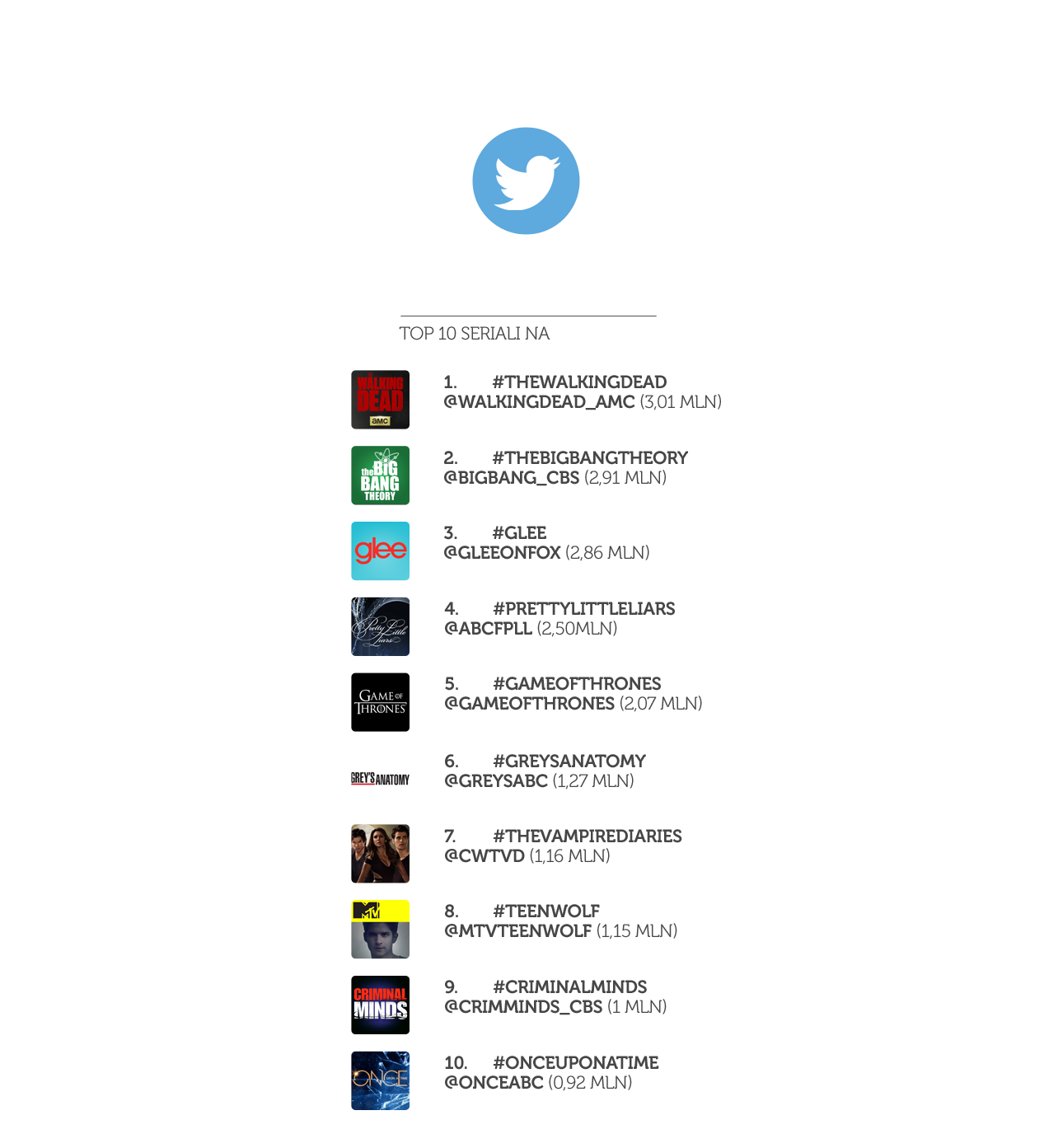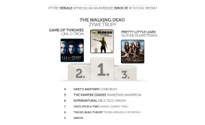 W raporcie Merlin.pl i Sotrender ujęliśmy również najpopularniejsze seriale na Twitterze – a tam niepodzielnie rządzi Rick i spółka w postapokaliptycznym świecie opanowanym przez żywe trupy. Oficjalny profil @WalkingDead_AMC śledzi ponad 3 mln obserwujących. Pierwsza piątka seriali na Twitterze to również: The Big Bang Theory, Glee, Pretty Little Liars, Gra o Tron mające więcej niż 2 mln fanów.