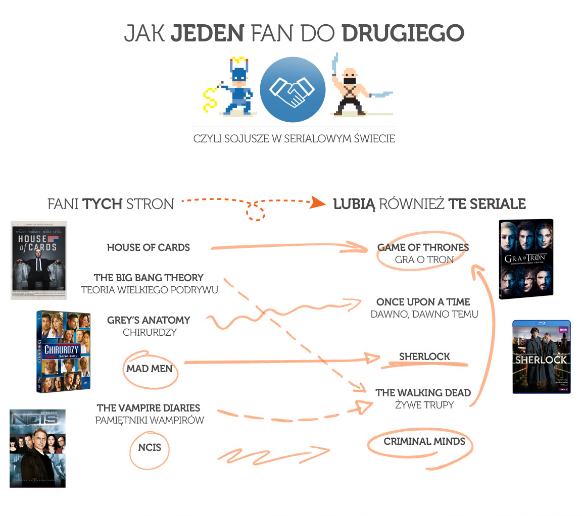 Badając współzależności między fanami seriali, w sklepie internetowym sprawdzamy zazwyczaj, jakie inne produkty z kategorii były przeglądane lub kupowane przez osoby zainteresowane danym tytułem. Tak oto fani House Of Cards szukają często serialu True Detective, poszukujący Gry o Tron przeglądają m.in. Breaking Bad, a amatorzy True Blood są zainteresowani takimi tytułami, jak Dexter, Pamiętniki Wampirów czy Fringe. Daria Duszyńska, merlin.pl.