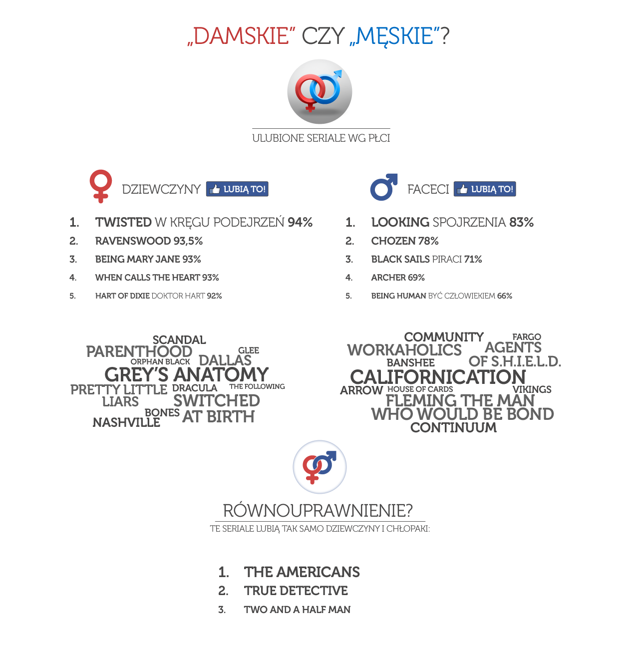 W raporcie merlin.pl i Sotrendera zbadaliśmy również, które seriale – na podstawie udziału fanów w zależności od płci – mogą uchodzić za „damskie” lub „męskie”. Panie zdobyły takie fanpage’e seriali jak Twisted (W kręgu podejrzeń), Ravenswood, Being Mary Jane, When Calls the Heart czy Hart of Dixie (Doktor Hart) – więcej niż 90% wszystkich fanów tych seriali to kobiety. W gronie fanów więcej przedstawicielek płci pięknej mają również Grey’s Anatomy, Glee, Dracula, The Following, Orphan Black, Bones (Kości), Pretty Little Liars oraz Nashville.