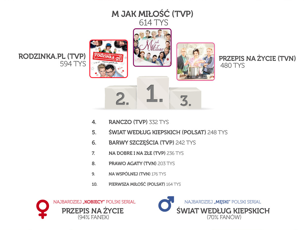 A które polskie seriale mogą uchodzić za „damskie” lub „męskie”? Produkcją, która w większości podbiła serca kobiet, jest Przepis na życie. Natomiast wśród panów króluje niepodzielnie Świat według Kiepskich.