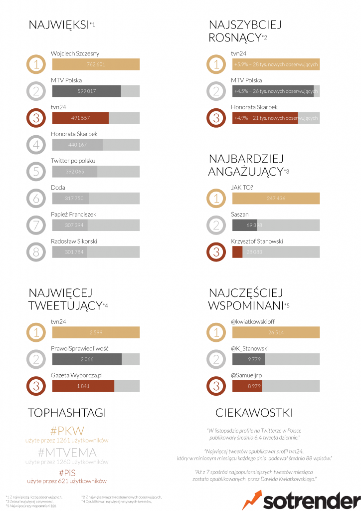Listopad upłynął pod znakiem wyborów samorządowych, nie dziwi więc, że odbiły się one wyraźnym echem na Twitterze, znanym w Polsce jako ulubiona platforma dziennikarzy i polityków. Problemy związane z liczeniem głosów przez Państwową Komisję Wyborczą sprawiły, że popularność hashtaga #PKW eksplodowała, a on sam był najpopularniejszym hashtagiem dnia przez cały tydzień. Ubiegły miesiąc był też czasem wzmożonej aktywności użytkowników Twittera, którzy publikowali przeciętnie o 6, 3% tweetów więcej niż w październiku. Jednocześnie liczba obserwatorów każdego z analizowanych przez Sotrender profili zwiększyła się średnio o 6, 9%, podczas gdy w październiku wzrost ten wynosił 5, 4%. Co jeszcze działo się na Twitterze w ubiegłym miesiącu?
