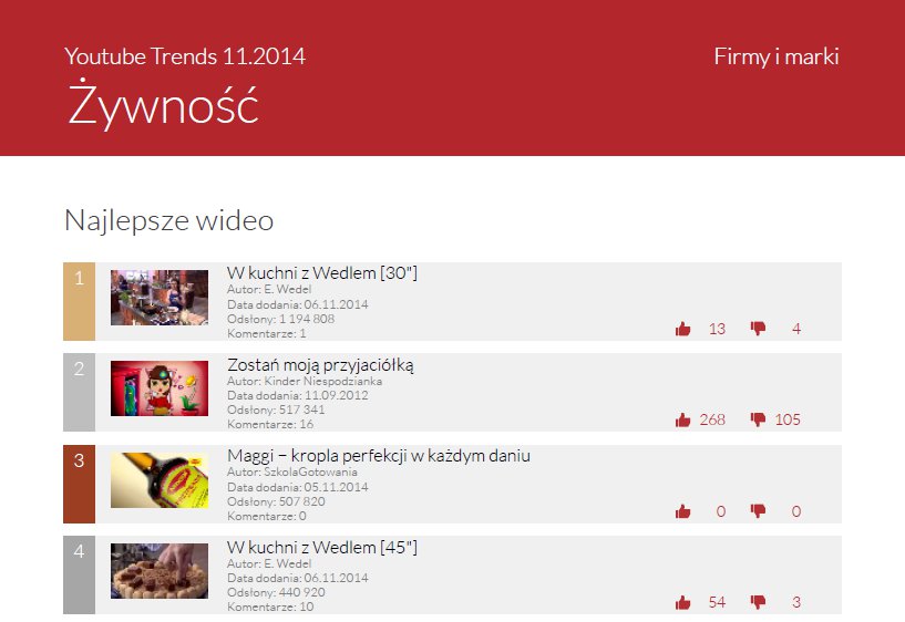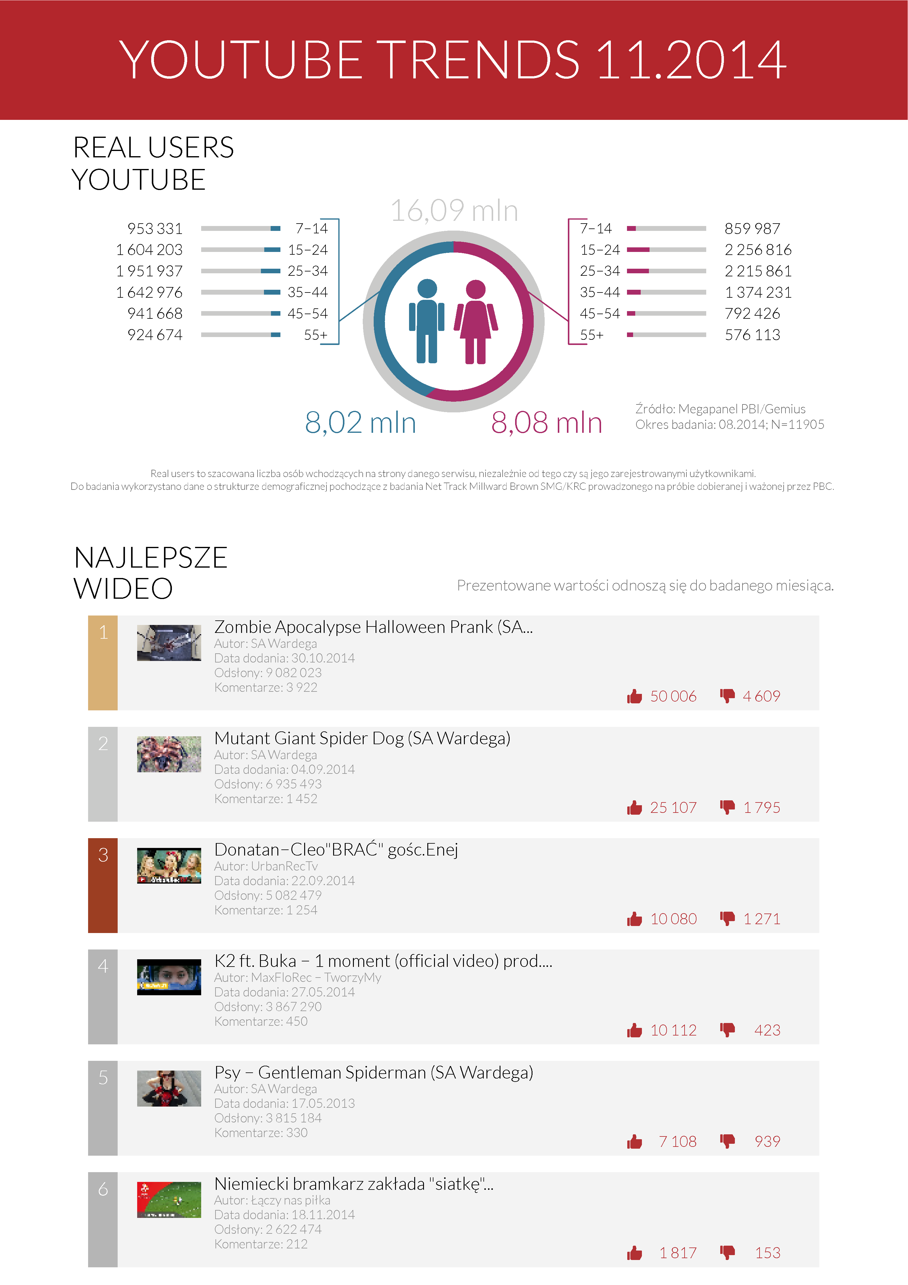 Listopad potwierdził, że czołówka kanałów z największą liczbą komentarzy oraz najpopularniejszych filmów na polskim YouTube nie uległa wielkim zmianom w stosunku do poprzedniego miesiąca. Najczęściej komentowanymi kanałami były: Polski Pingwin, reZigiusz i Blowek. Te same profile zajmowały miejsca na podium w październiku, tylko w nieco innej kolejności – wtedy pierwszy był reZigiusz, następnie Polski Pingwin i Blowek. Ponadto tylko dwa spośród dziesięciu najbardziej komentowanych filmów nie zostały opublikowane na wspomnianych kanałach. Mowa o filmie SA Wardęgi “Zombie Apocalypse Halloween Prank”, który zebrał w ubiegłym miesiącu najwięcej “kciuków w dół” oraz o wideo Maxa Kolonko, “Polska i Żydzi – Max Kolonko Mówi Jak Jest”. Wśród najpopularniejszych filmów w listopadzie, tak jak i w październiku, dominowała muzyka i rozrywka, ale pojawił się też film o tematyce sportowej, czyli “Niemiecki bramkarz zakłada “siatkę”…” Więcej zmian i nowości pojawiło się za to w poszczególnych branżach, takich jak kosmetyki, samochody czy żywność.