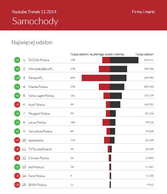 Sporo zmian nastąpiło w listopadzie w kategorii “Samochody”. W rankingu według największej liczby odsłon na drugiej pozycji – po skoku aż o czternaście miejsc – znalazł się kanał Renault. Z kolei BMW Polska spadł o trzynaście miejsc, zajmując ostatnią lokatę rankingu. Pierwsze i drugie miejsce przypadły kanałom SKODA Polska oraz MercedesBenzPL. W rankingach według liczby aktywności i interaktywności wyróżniła się z kolei Kia Motors Polska, która po skokach o odpowiednio 14 i 15 miejsc, w obu rankingach uplasowała się na trzecim miejscu podium.