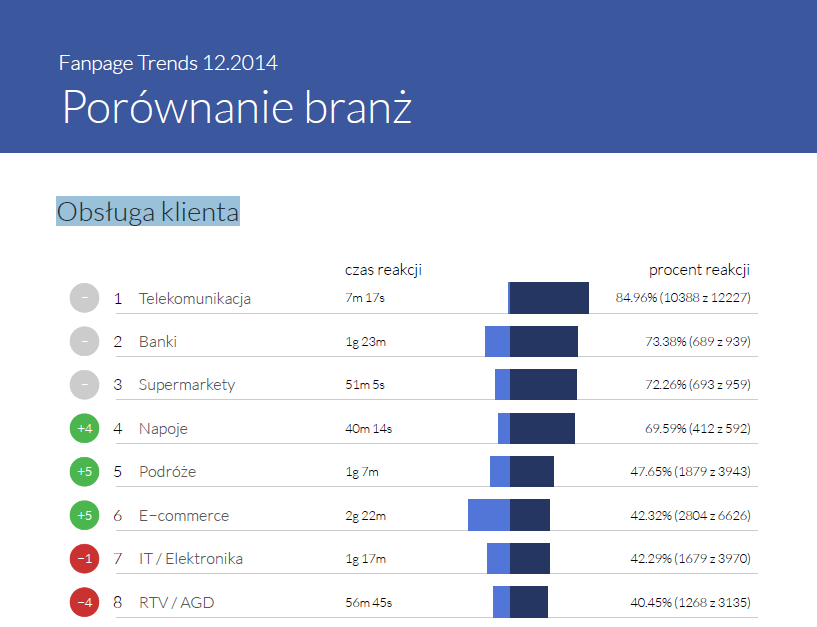 Przed trzema miesiącami wprowadziliśmy do raportów Fanpage Trends zestawienia biorące pod uwagę coraz ważniejszy aspekt obecności stron w mediach społecznościowych, mianowicie obsługę klienta. Od tego czasu sporo się zmieniło. Przede wszystkim kolejne marki decydują się na umożliwienie użytkownikom dodawania postów na ich stronach. Nie jest to dla administratorów stron łatwa decyzja, ponieważ wymaga ona uprzedniego przygotowania odpowiednich procesów. Nie da się jednak nie zauważyć, że liczba stron obsługujących klientów za pośrednictwem Facebooka rośnie. Jednocześnie spada czas, którego potrzebują administratorzy stron, aby udzielić odpowiedzi. W ciągu ostatnich trzech miesięcy najbardziej spektakularną poprawę czasu odpowiedzi zaliczyła strona hotelu W drzewach, która poprawiła swój czas odpowiedzi o… 608 godzin. Na drugim miejscu pod względem poprawy czasu odpowiedzi uplasowała się Rebel.tv, która poprawiła się o 415 godzin, a na trzecim Galeria Twierdza Zamość, która odpowiada o 312 godzin szybciej. Z kolei pod względem procenta udzielonych odpowiedzi największy wzrost odnotowały profile Lindt Polska (wzrost o 93 punkty procentowe), Galeria ASKANA (wzrost o 87 punktów procentowych) i Marwit (wzrost o 85 punktów procentowych). Oby tak dalej!