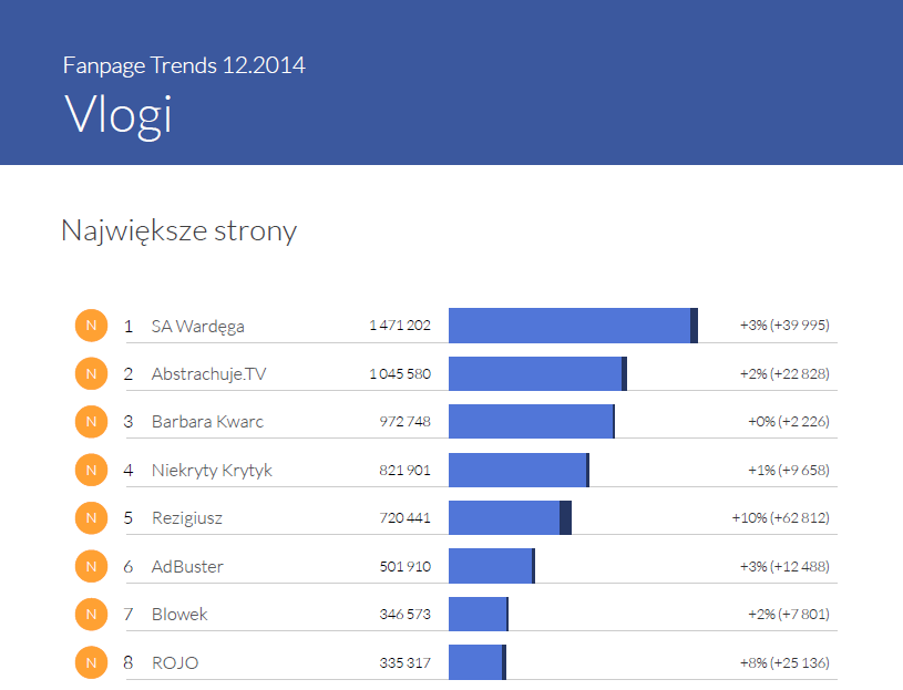 Grudzień to sprzyjający czas dla administratorów profili, którzy wpisując się w nurt tematyki świątecznej, skutecznie angażują użytkowników. W grudniu wzmianki o świętach znalazły się w 15% wszystkich opublikowanych wpisów. Jednocześnie posty opublikowane w święta angażowały o 61% więcej użytkowników niż przeciętnie, czyli o 7% więcej niż przed rokiem. Przełożyło się to na poprawę wyników większości profili z zestawienia najbardziej angażujących stron polskojęzycznych. W ramach nieco spóźnionego prezentu świątecznego, zdecydowaliśmy się wprowadzić do Fanpage Trends odrębną kategorię dedykowaną vlogerom. Który z nich radzi sobie na Facebooku najlepiej? Zapraszamy do lektury grudniowego wydania raportu Fanpage Trends!