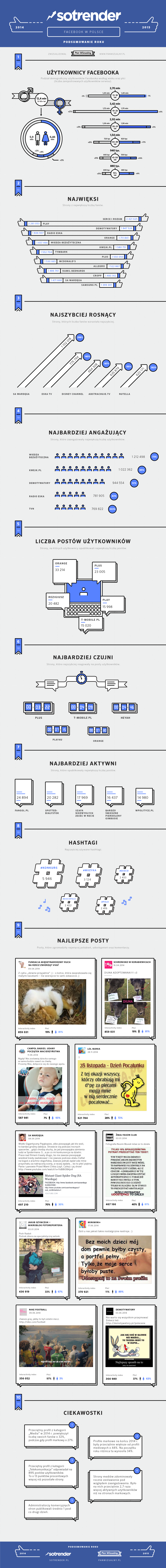 Jak wyglądał Facebookowy krajobraz pod koniec 2014 r.? Przede wszystkim stał się mniej homogeniczny niż w roku 2013 r. Nie da się nie zauważyć, że ostatnie 12 miesięcy przyniosło odpływ z Facebooka młodzieży z grupy 13-18 lat i jednoczesny znaczący wzrost liczby użytkowników, który przekroczyli 50. rok życia oraz tych tych z grupy wiekowej 41-50 lat. Jednocześnie, jak pokazuje zestawienie najpopularniejszych postów 2014 r. – na Facebooku nadal królują kotki i pieski (dwa najlepsze posty zostały opublikowane przez organizacje pozarządowe), a nad tematami trudnymi i wywołującymi emocje nadal zdecydowaną przewagę mają tematy lekkie, miłe i przyjemne, takie jak dzień pocałunku, przerażający pająkpies i królik Bugs twierdzący, że nie warto się za bardzo wszystkim przejmować. Zarazem wielcy reklamodawcy (czy duże firmy) coraz częściej rezygnują z komunikatów rozrywkowych i prowadzą komunikację bardziej zbliżoną do produktu, najcześciej wspieraną przez duże wydatki na promowanie postów i, coraz częściej, także wideo. Z kolei najpopularniejsze hashtagi roku, które również uwzględniliśmy na infografice, zdradzają co nieco na temat głównego celu korzystania przez Polaków z Facebooka, jak również ich gustu muzycznego. 🙂