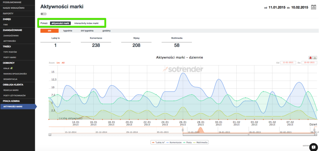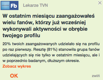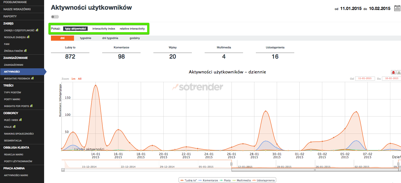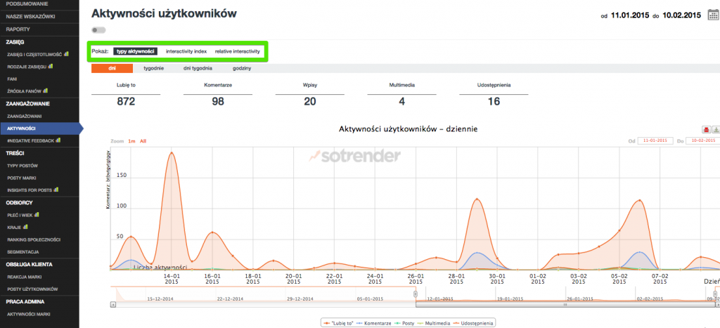 Zaangażowanie: Na ekranie Aktywności znalazły się tylko aktywności (polubienia, komentarze, itd.) użytkowników, natomiast działania prowadzącego profil przenieśliśmy do nowej kategorii “Praca admina”. W aktywnościach umieściliśmy też Interactivity Index i Relative Interactivity, czyli nasze autorskie wskaźniki pokazujące inny aspekt aktywności fanów. Zrezygnowaliśmy natomiast ze wskaźnika Ludzie, którzy o tym mówią (People Talking About This), który ze względu na swój niejednorodny charakter (łączenie zaangażowania i nowych fanów) i skomplikowany sposób liczenia (średnia krocząca z kilku dni) jest trudno intepretowalny. Sam Facebook od pewnego czasu wycofuje się z tego wskaźnika.