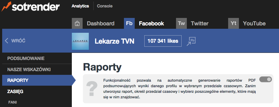 Zasięg: statystyki zasięgu na bazie Facebook Insights podzieliliśmy na 2 części: Zasięg i częstotliwość, w której prezentujemy łączny zasięg, liczbę odsłon oraz częstotliwość kontaktów z 1 użytkownikiem w poszczególnych dniach (łączna liczba odsłon dzielona przez łączny zasięg), oraz Rodzaje zasięgu, przedstawiające liczbę użytkowników, do których dany profil dotarł w sposób organiczny, wirusowy i płatny. Dodaliśmy też nowy ekran Źródła fanów, pokazujący, skąd przychodzą osoby, które polubiły nasz profil.