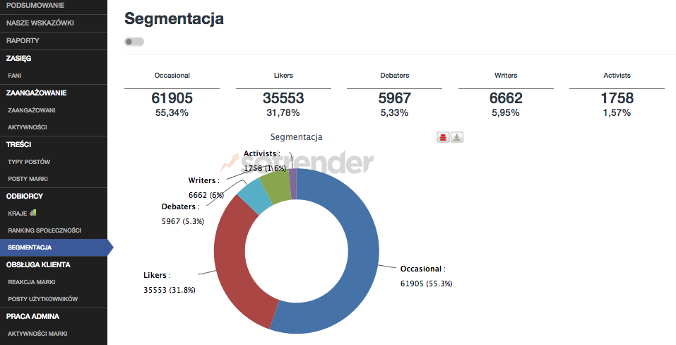 Odbiorcy (społeczność): ten dział mocno rozbudowaliśmy. Obecnie można tu znaleźć wszystkie dostępne informacje na temat ludzi, do których dociera prowadzona przez nas komunikacja: Płeć i Wiek (tylko dla własnych profili – dane Facebook Insights), informacje o Krajach, z których pochodzą użytkownicy, Ranking społeczności, pokazujący zaangażowanych fanów z podziałem na segmenty oraz Segmentację, pokazującą udział poszczególnych segmentów wśród wszystkich zaangażowanych użytkowników.