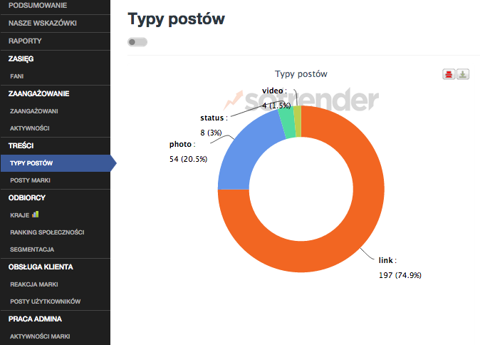 Treści: dodaliśmy nowy ekran Typy postów, na którym podsumowujemy udział różnych typów treści w komunikacji w danym przedziale czasowym. Dodatkowo dla własnych profili można obserwować też tzw. Facebook Insights for Posts – dokładne statystyki zmian zasięgu w czasie (trzeba w tym celu aktywować tzw. dane prywatne).
