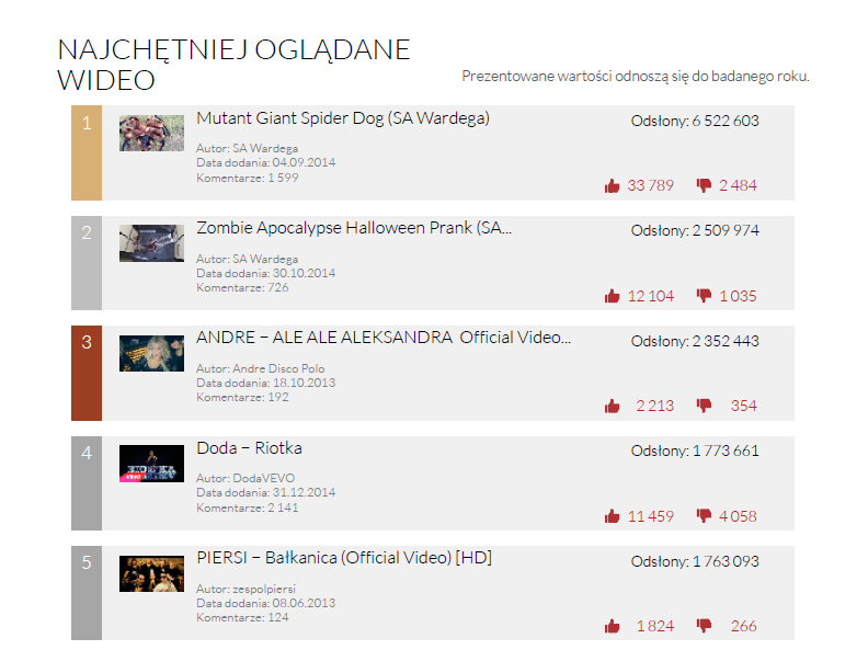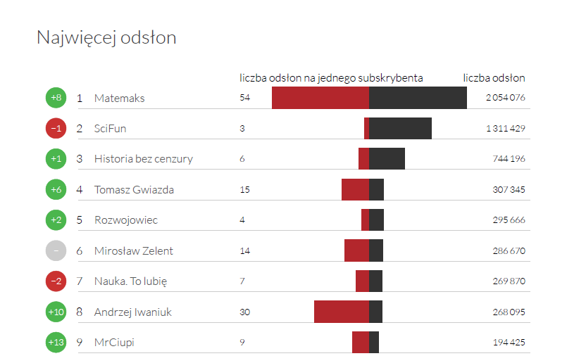 Styczeń był miesiącem zmian w rankingach według liczby odsłon kanałów. Trzynaście z piętnastu najchętniej oglądanych kanałów poprawiło swoją pozycję w stosunku do grudnia. Rekordzistą jest kanał Magic Records, który zanotował wzrost aż o 74 miejsca! Aż tak spektakularnych wzrostów nie odnotowaliśmy w innych kategoriach, choć również w zestawieniu największych kanałów niewiele ostało się na swoich grudniowych pozycjach. Tylko SA Wardęga zachował pozycję z poprzedniego miesiąca (tak, pierwszą), pozostałe kanały piętnastki zanotowały wzrosty, co oznacza, że kilka wypadło z czołówki. Największy wzrost pod względem liczby subskrybentów to awans o 12 pozycji JDabrowsky’ego, który w styczniu pojawił się w zestawieniu. W interaktywności kolejny miesiąc z rzędu nie mają sobie równych vlogerzy gamingowi – na pierwszym miejscu znalazł się Gimper, a niższych stopniach podium – ReZigiusz i Mandzio.