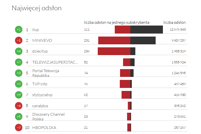 Najsilniej obecną na YouTube marką telewizyjną jest TVP. W piętnastce najpopularniejszych kanałów telewizyjnych znalazło się miejsce dla pięciu kanałów Telewizji Polskiej – flagowego itvp oraz dziecitvp, stylzyciatvp, TVP Info i muzykatvp. Najaktywniejszą stacją telewizyjną na YouTube jest kojarzona z prawą stroną sceny politycznej TV Republika, od początku istnienia kanału opublikowała ponad cztery tysiące filmów. Nie do końca przekłada się to na liczbę wyświetleń – 13 mln odtworzeń to na pewno nie jest ich wymarzony wynik.