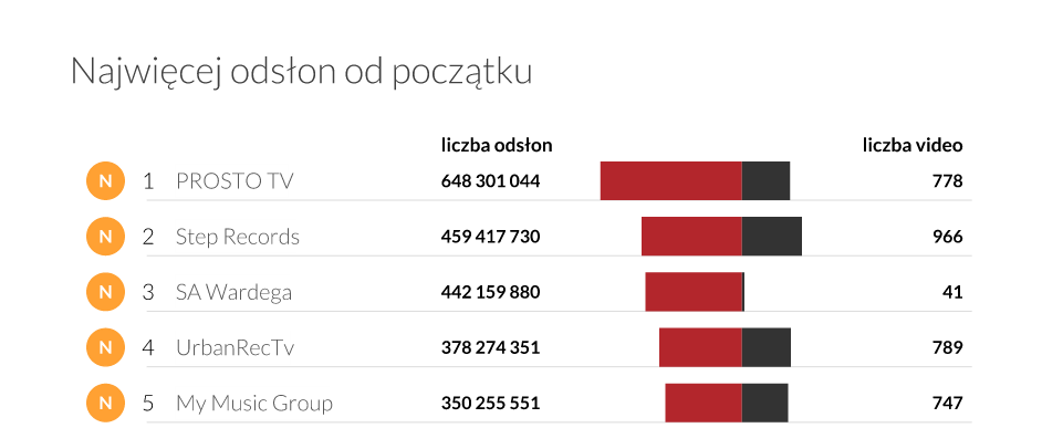 W najnowszym wydaniu raportu debiutują nowe zestawienia – względem łącznej liczby wyświetleń kanałów od początku ich istnienia oraz łącznej liczby opublikowanych przez nie fimów. SA Wardęga jest na miejscu trzecim, wyprzedzają go kanały wytwórni muzycznych: PROSTO i Step Records. Jednak, by osiągnąć swój wynik Wardęga potrzebował tylko 41 filmów, natomiast PROSTO i Step Records opublikowały ich odpowiednio 778 i 699.