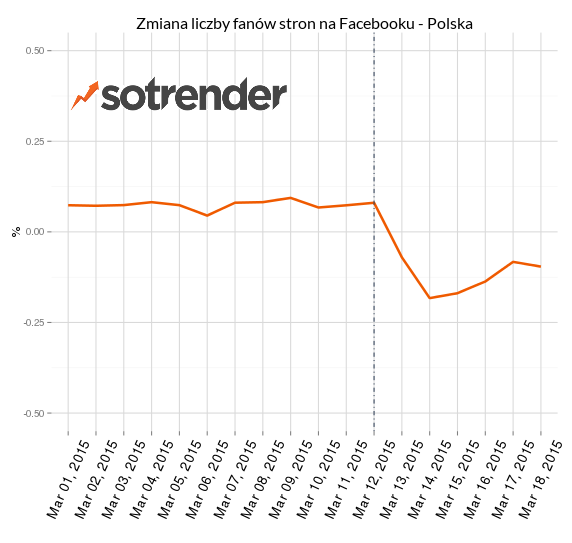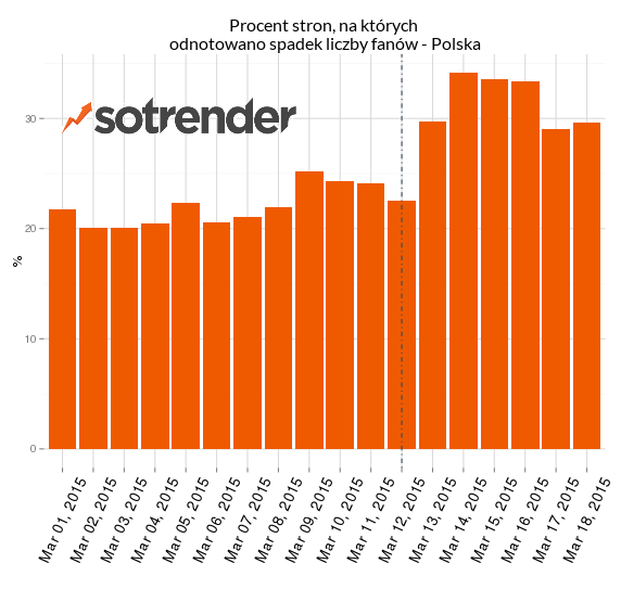 Choć strony na Facebooku tracą polubienia codziennie z rozmaitych powodów, zwykle te spadki nie są znaczące (ani widoczne) i dotyczą nie więcej niż 25% stron dziennie (pamiętajcie, że codziennie spadki dotykają innych profili). Między 13. a 18. marca zauważyliśmy znaczący wzrost liczby stron, którym spadła liczba fanów.