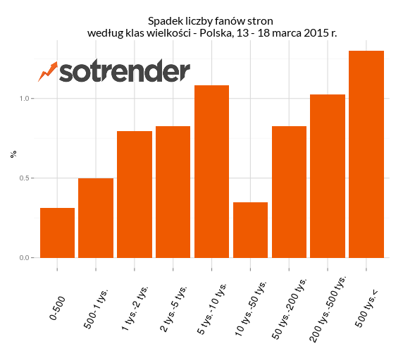 W okresie od 13 do 18 marca br. najbardziej znaczące spadki liczby polubień stron odnotowaliśmy w przypadku największych profili (liczących powyżej 500 tys. fanów) oraz takich, których liczba fanów wahała się od 5 do 10 tys. – spadek wyniósł na nich ponad 1, 5%. Dla odmiany niewielkie spadki wynoszące poniżej 0, 5% odnotowały najmniejsze strony oraz te o średniej wielkości (posiadające między 10 a 50 tys. fanów).