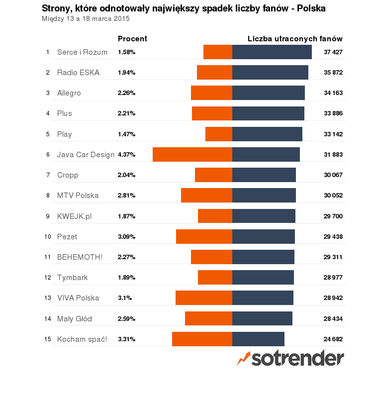 Najbardziej znaczące spadki liczby fanów w Polsce dotknęły strony: Serce i Rozum, Radio Eska oraz Allegro. Z kolei biorąc pod uwagę procentowy spadek liczby fanów, w wyniku wiosennych porządków najbardziej ucierpiały strony ‘Kasia’ Ewa Skowronska, która straciła 15, 91% fanów oraz NO! NO! NO! i Pimax Art Bookbindery, Introligatornia Artystyczna, Exclusive Gifts, które straciły odpowiednio po 14, 30% fanów oraz 7, 72% fanów.