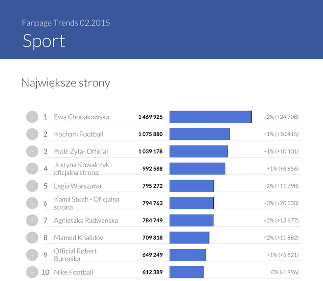 Facebook jest kanałem najczęściej używanym we wszystkich branżach ze względu na wysokość budżetów przeznaczanych na działania w jego obrębie oraz największy zasięg tego medium. YouTube sprawdza się znakomicie w sytuacjach, gdy dysponujemy unikatowymi materiałami, co w przypadku treści wideo nie jest takie proste. Co raz więcej sportowców i klubów komunikuje się z fanami na Instagramie, dostarczając ciekawych zdjęć z treningów czy z życia codziennego, które niezmiennie wzbudzają zainteresowanie odbiorców. Twitter sprawdza się szczególnie dobrze w przypadku sportowców działających międzynarodowo, którzy komunikują się w więcej niż jednym języku. Nie można zapomnieć także o zyskującym coraz większą popularność Snapchacie. Jednak podczas gdy w Stanach Zjednoczonych cieszy się on bardzo dużą popularnością wśród koszykarzy NBA, sportowcy i celebryci w Polsce dopiero się do niego przekonują. Z cyklicznych raportów Sotrendera “Fanpage Trends” dowiadujemy się, że kategorię sport na Facebooku otwiera Ewa Chodakowska, która zdominowała wszystkie rankingi i co miesiąc angażuje prawie ćwierć miliona fanów.