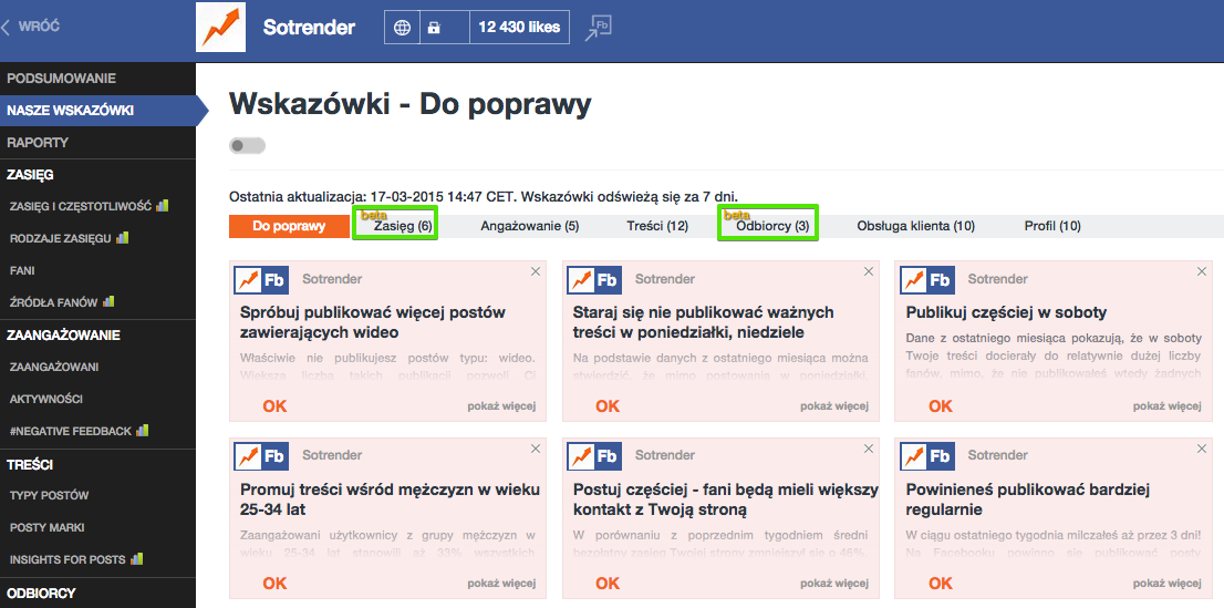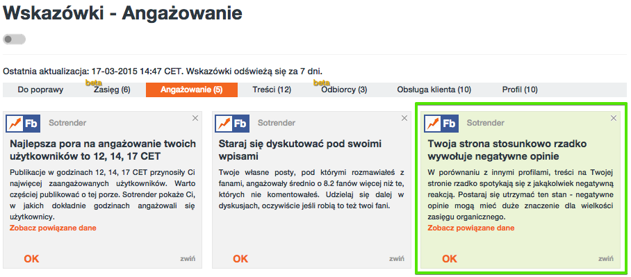 W obliczu nieustannie obniżającego się zasięgu postów, walka o możliwie jak największą widoczność publikowanych treści staje się kluczowym aspektem działalności na Faceboku. Aby ułatwić nierówną walkę ze spadkami zasięgu, udostępniamy Wam nowy zestaw automatycznych wskazówek opartych na danych z Facebook Insights, dzięki którym sprawdzicie, jakie są możliwe przyczyny słabego zasięgu Waszych postów oraz dowiecie się, jak możecie go poprawić. Od dziś dzięki wskazówkom Sotrendera możecie zobaczyć, jak skuteczne były prowadzone przez Was kampanie promocyjne. Przygotowując je, skupiliśmy się przede wszystkim na konwersji płatnego zasięgu na zaangażowanie, czyli jednym z najważniejszych wskaźników efektywności działań w mediach społecznościowych.