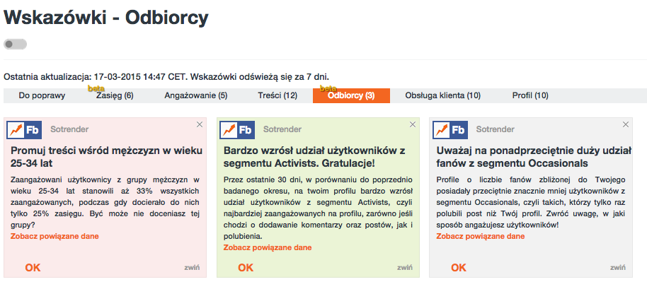 Nowe wskazówki ulokowane zostały w dwóch dodatkowych zakładkach w głównym menu Wskazówek: Zasięg oraz Odbiorcy.