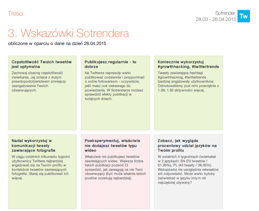 Niedawno zaktualizowaliśmy nasze bazowane na danych wskazówki dla stron na Twitterze, kanałów na YouTube i profili na Twitterze. Wprowadziliśmy nowy layout dla automatycznych rekomendacji, tak jak i nowy zestaw wskazówek związanych z obsługą klienta w social media. Feedback od naszych klientów oraz analizy stworzone przez Sotrender Research Team udowodniły już swoją wartość.