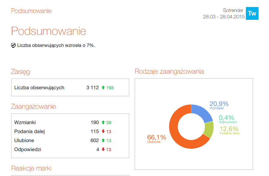 Wszyscy cierpią na brak czasu, marketerzy również. Dlatego Sotrender postanowił ułatwić raportowanie działań na Twitterze, jak to tylko możliwe. Nowa funkcja narzędzia – automatyczne raporty – pozwoli wygenerować profesjonalny, obszerny i spersonalizowany raport dotyczący najważniejszych aspektów działalności na Twitterze. Możecie użyć ich, by pod koniec miesiąca przygotować raport dla klientów lub przełożonych. Bazą raportów mogą być dane dzienne, tygodniowe lub miesięczne, podobnie, jak w przypadku raportów dla Facebooka. Co najważniejsze, generowanie raportu to tylko kilka kliknięć.