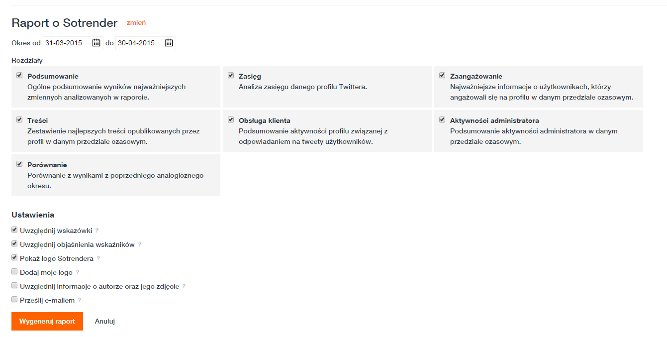 Od teraz możesz wybierać elementy, które będą uwzględnione w Twoim raporcie. Możesz wybrać między kolejnymi rozdziałami dotyczącymi różnych aspektów komunikacji naTwitterze.